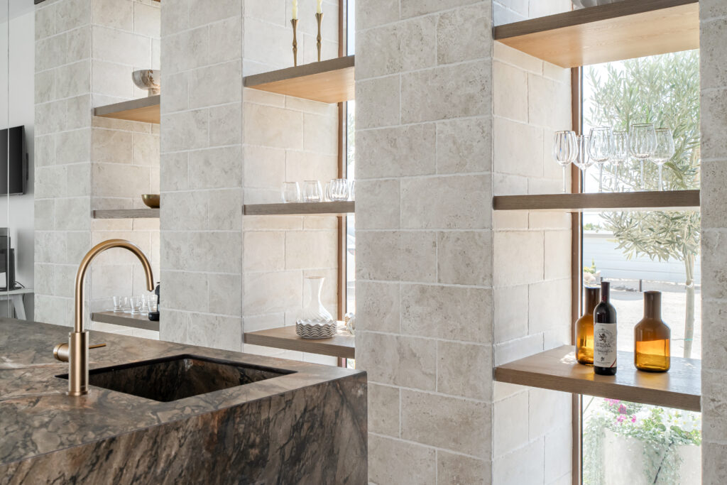 החלל המרכזי, שבו יושבים היזמים עם הרוכשים הפוטנציאליים לקפה ועוגה, תוך עיון בתוכניות ומענה על שאלות, מציג את בחירותיה של אסתי במלוא תפארתן. גולת הכותרת של החלל הוא אי גדול שעשוי ממשטח פורצלן מבית אבן קיסר שגולש עד לרצפה, בעיצוב מונוליטי עם המשכיות מלאה. מדובר במשטח מדגם Cider Stone 909 , משטח בגוון חום עשיר ועמוק עם נגיעות זהובות עדינות ומראה טבעי ואלגנטי. גב האי עשוי מעץ בצבע אגוז חם, והוא מואר על ידי גופי תאורה עם מראה נוסטלגי שמבליט אלמנטים מוזהבים. המוטיב המוזהב חוזר גם בברז הנחושת של האי, שניצב לצד כיור שבנוי מאותה אבן ומותקן בהתקנה תחתונה. לצד האי ניצבים כיסאות בר מודרניים עם רגליים בצבע חלודה וריפוד בגוון שמנת עדין.